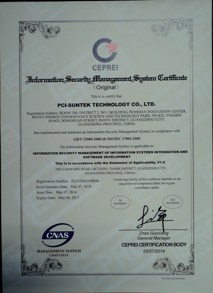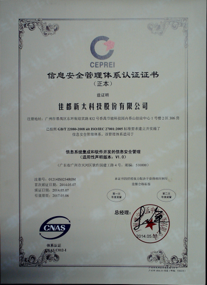 2014年3~4月,JDB电子科技顺利通过了国际标准及权威的ISO27001信息安全认证体系和ISO20000信息技术服务管理体系,取得了广州赛宝认证中心颁发的ISO/IEC 27001:2005信息安全管理体系认证证书和ISO/IEC 20000-1:2011信息技术服务管理体系认证证书。